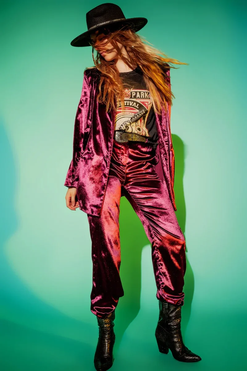 Rompe con lo convencional con esta espectacular americana extragrande en un vibrante tono morado magenta. Confeccionada en un terciopelo de acabado brillante y tacto lujoso, esta chaqueta captura la luz y las miradas a partes iguales.