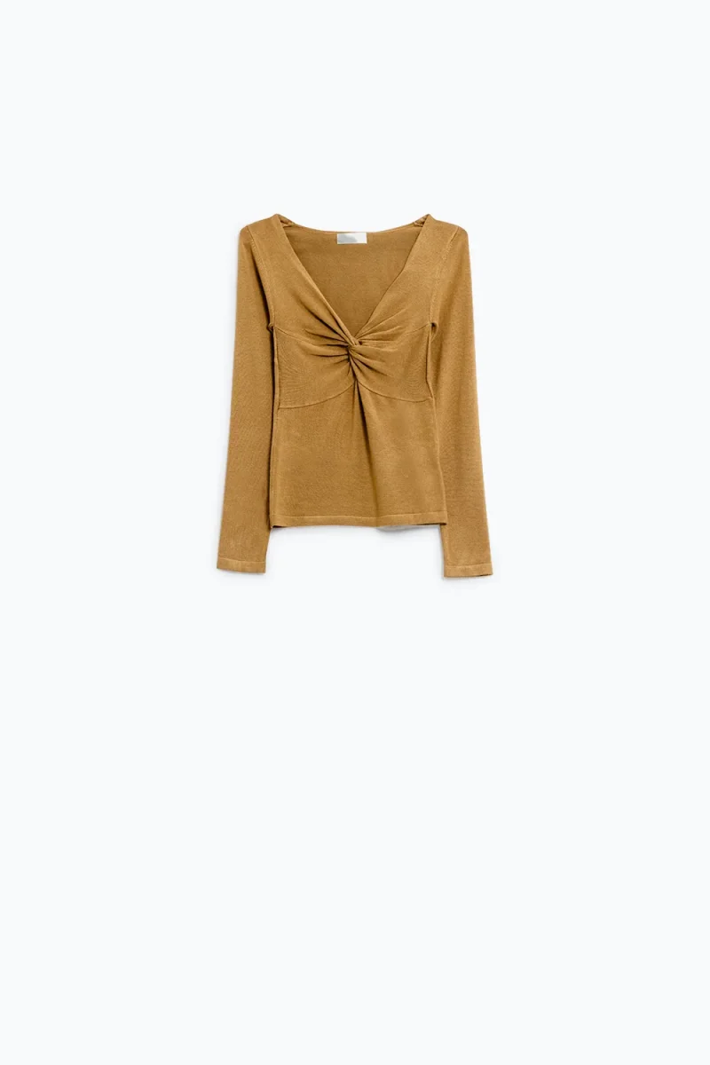 - Look de Oficina Sofisticado: Es ideal para llevar bajo un blazer. El escote en V y el detalle del nudo añadirán un toque femenino y trabajado a tu traje de chaqueta. Perfecto con pantalones sastre de color negro, crudo o marrón.