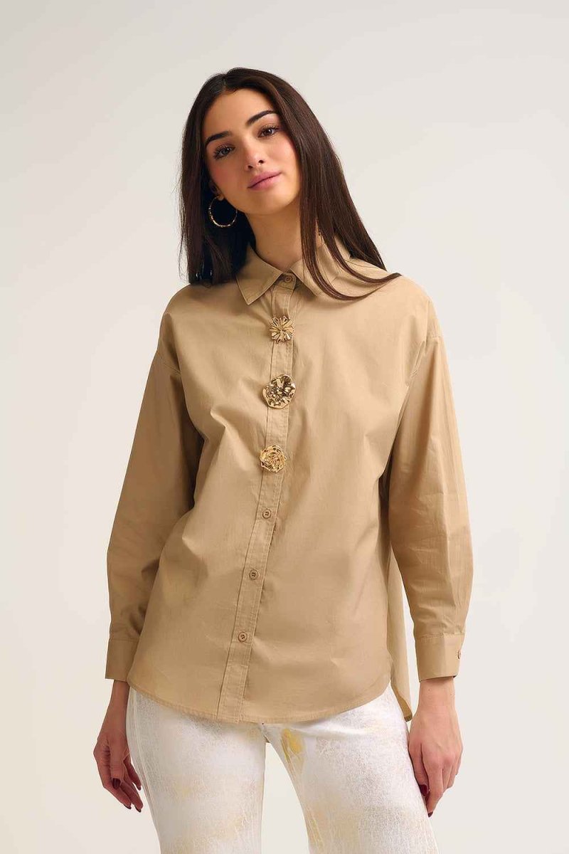 Su diseño amplio y relajado se ve elevado por el detalle definitivo: maxi-botones dorados con textura que brillan sutilmente sobre el tejido mate, aportando un aire de lujo y sofisticación instantáneo. Es la interpretación moderna del estilo «Safari Chic», perfecta para quienes buscan elegancia sin estridencias.