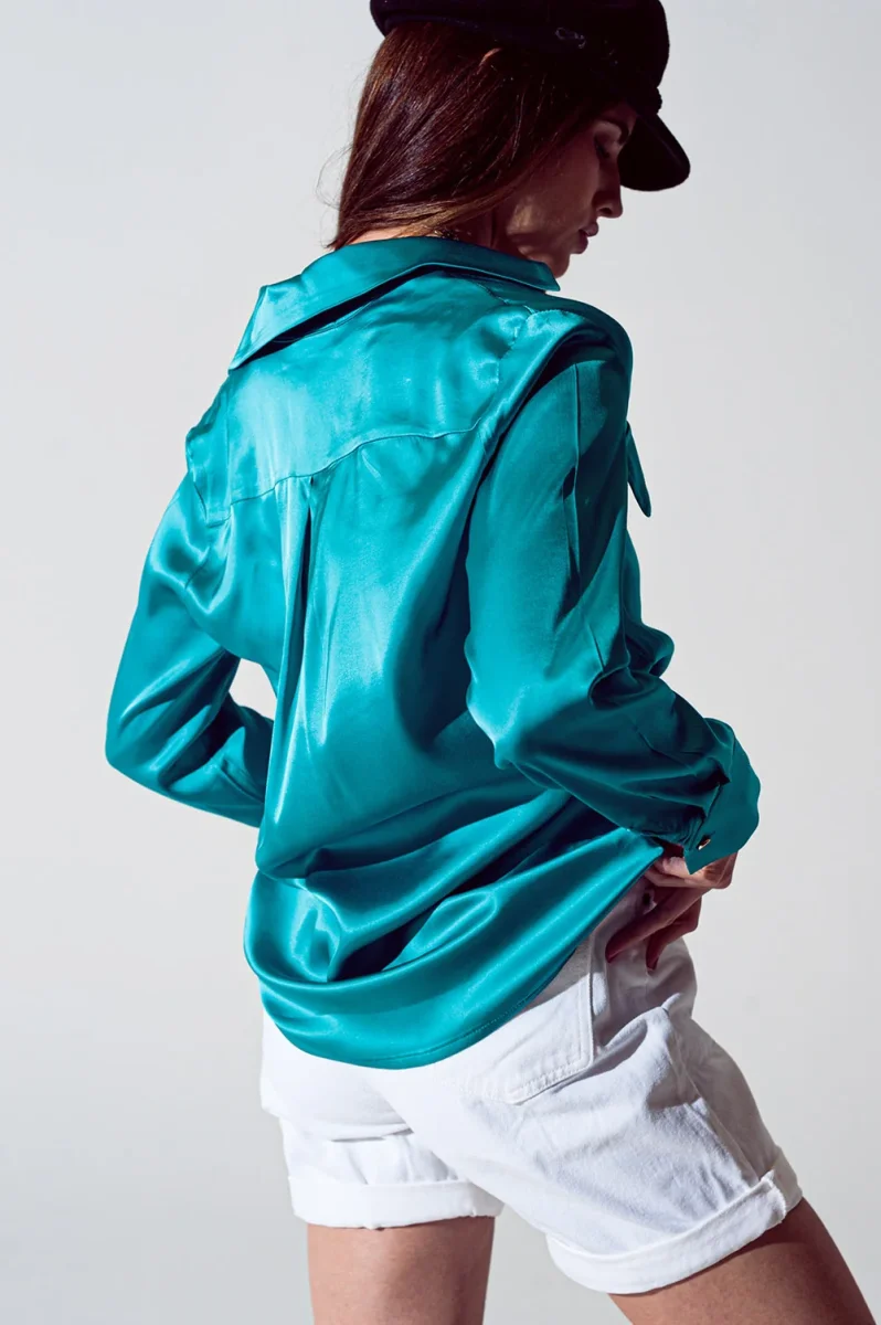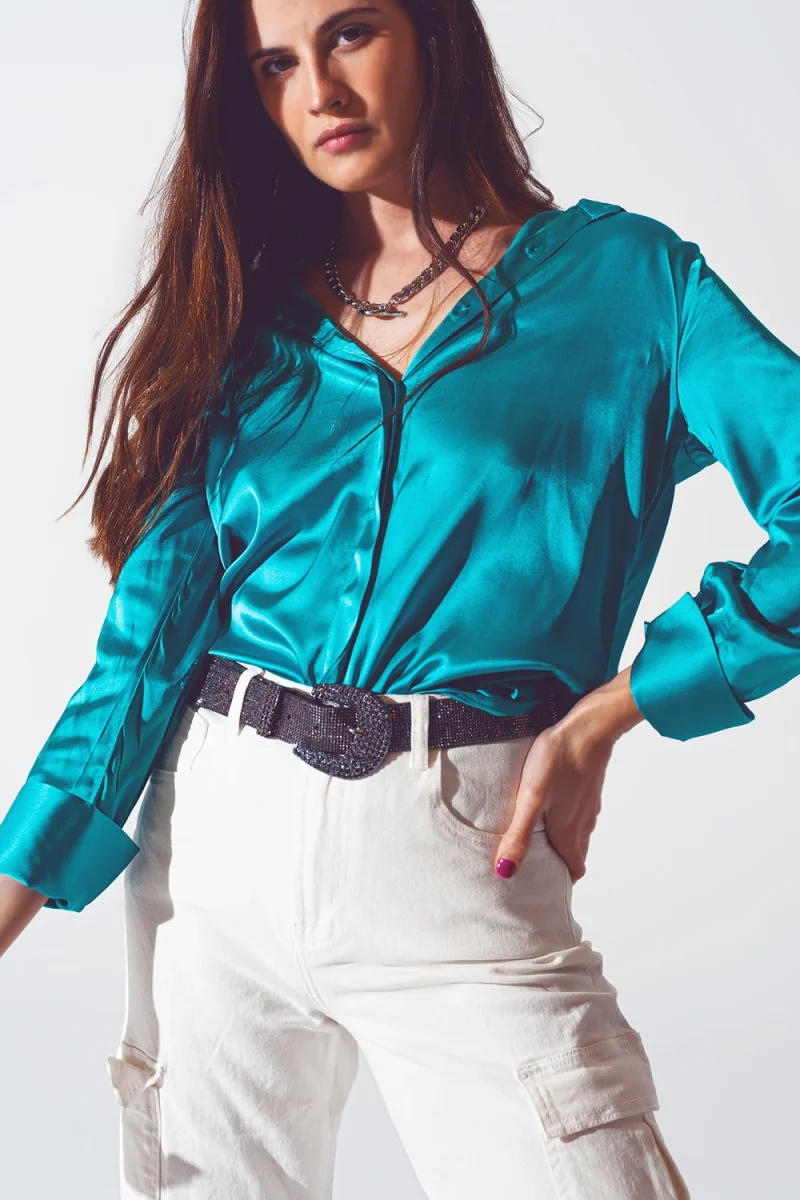 Sumérgete en el lujo líquido con esta camisa satinada en un magnético color turquesa joya. Más allá de su brillo sofisticado, lo que realmente enamora de esta prenda es su tacto: confeccionada en una mezcla premium de 55% Rayón y 43% Viscosa, ofrece una suavidad sedosa, transpirabilidad y una caída fluida que acaricia la piel, muy superior al satén convencional.
