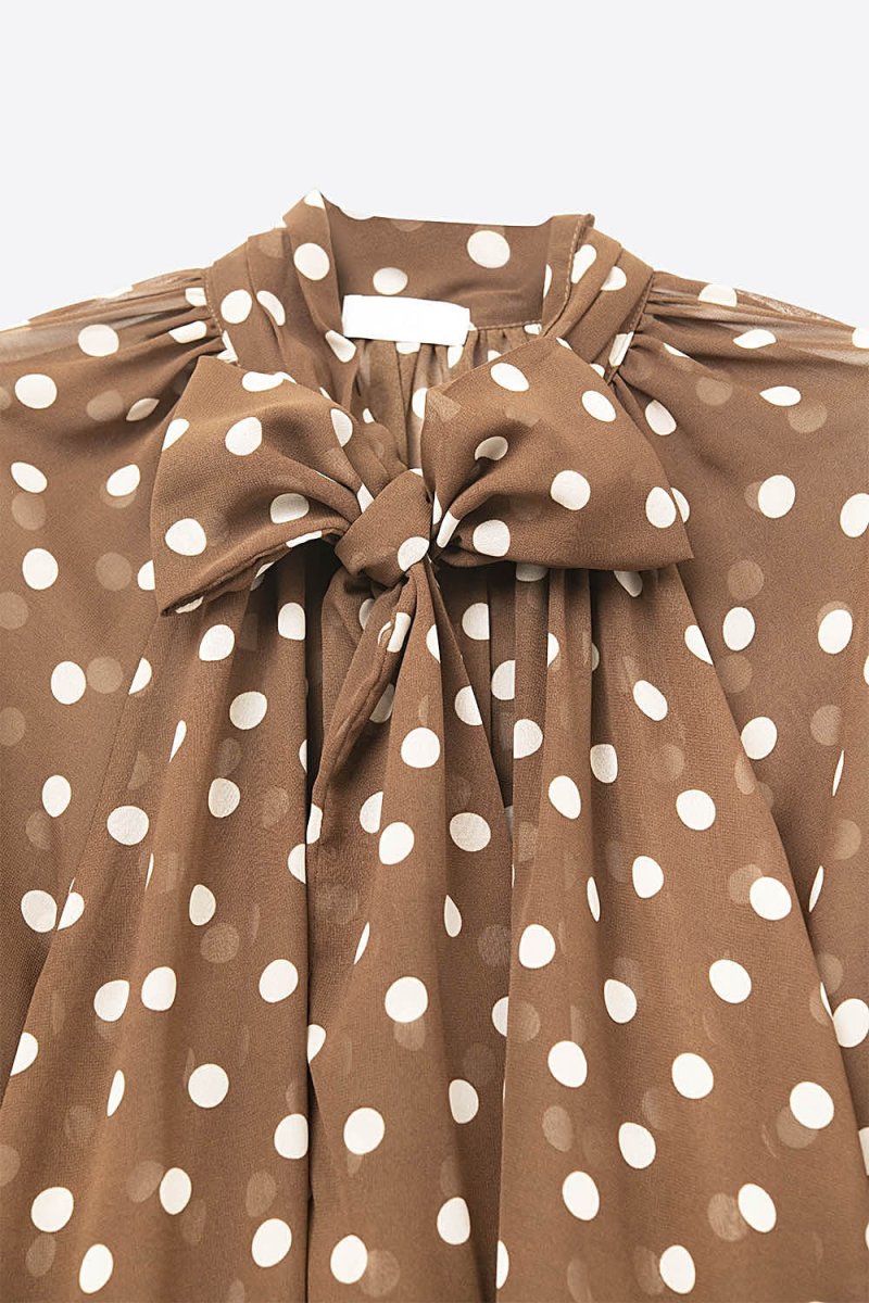El cautivador color marrón de la camisa se adorna con un patrón de lunares que añade un aire retro y divertido, perfecto para cualquier ocasión, desde una salida casual con amigos hasta una cena elegante. Los lunares están dispuestos de manera armoniosa, creando un equilibrio visual que llama la atención sin ser abrumador.