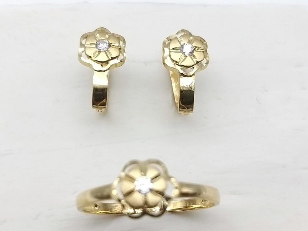 Conjunto de Comunión en oro de 18 ktes, compuesto por sortija y par de pendientes con forma de Flor en acabado brillo/mate y cierre en palillo catalán.