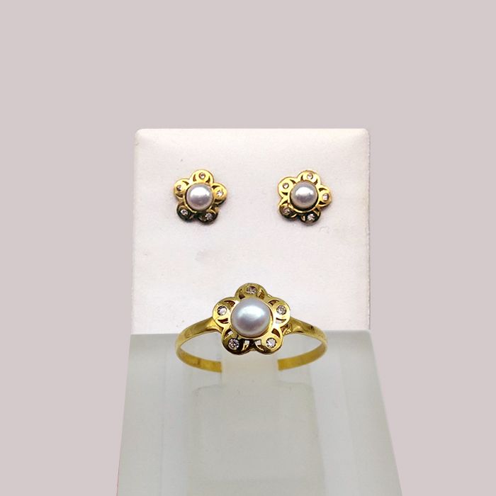 Conjunto de Comunión en oro de 18 ktes, compuesto por sortija y par de pendientes con forma de flor y perla central de 4mm, cierre en palillo de presión.