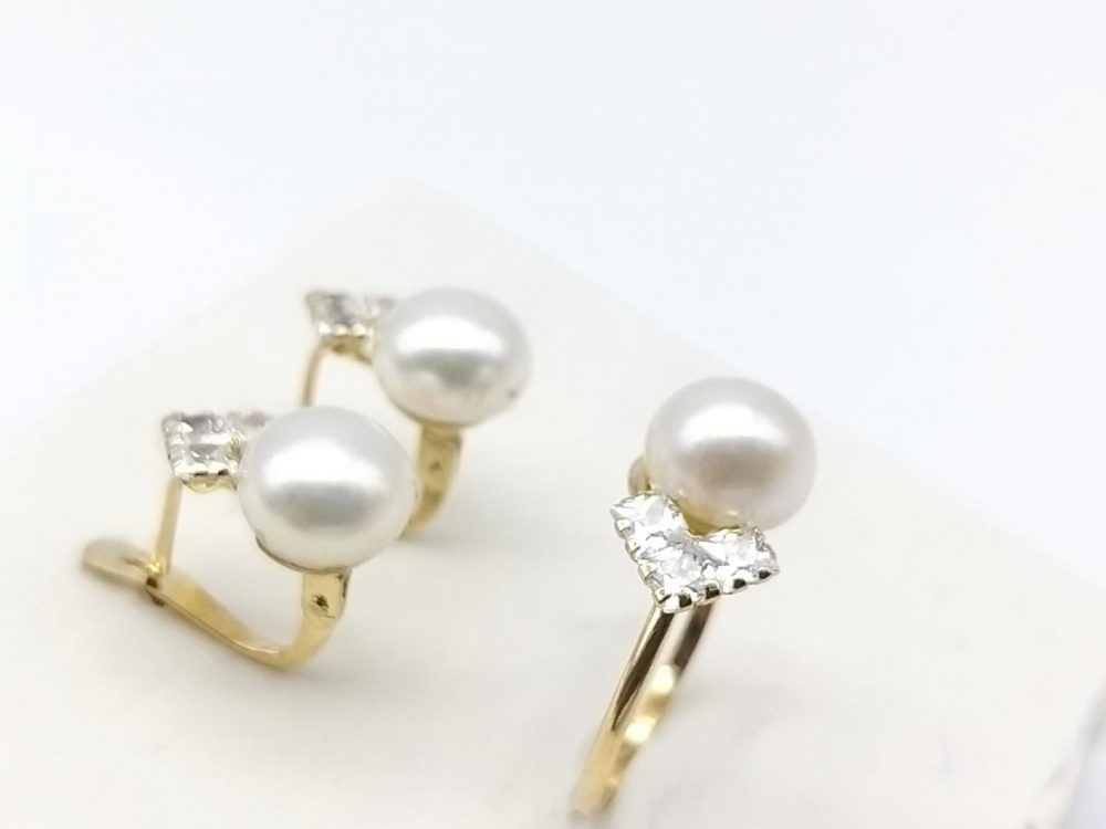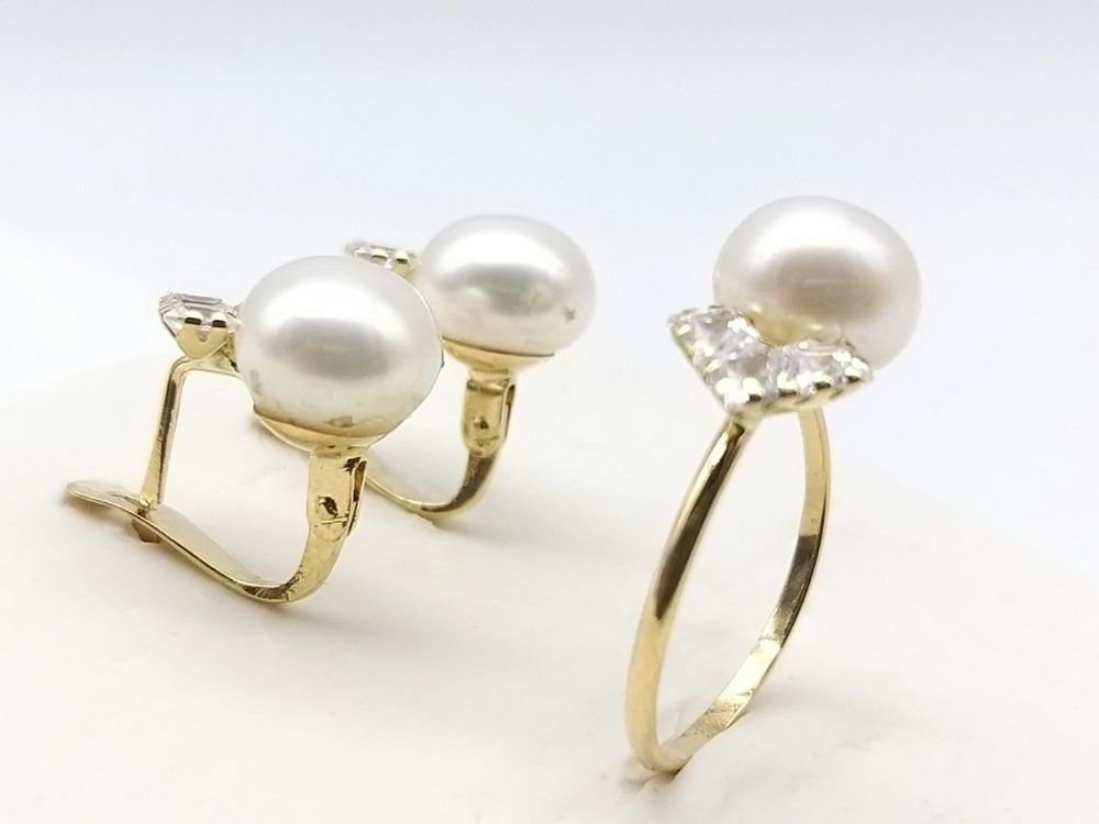 Conjunto de Comunión en oro de 18 ktes, compuesto por sortija y par de pendientes con perla de 7mm, circonitas y cierre en palillo catalán.