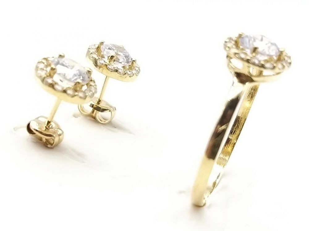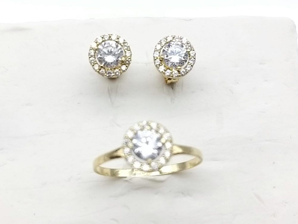 Conjunto den Comunión en oro de 18 ktes, compuesto por sortija y par de pendientes forma redonda con circonitas de 7.8mm de ancho, cierre en palillo de presión