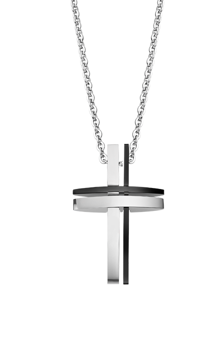 Cruz en plateado y negro con líneas caladas en acero y cadena, Lotus Style.