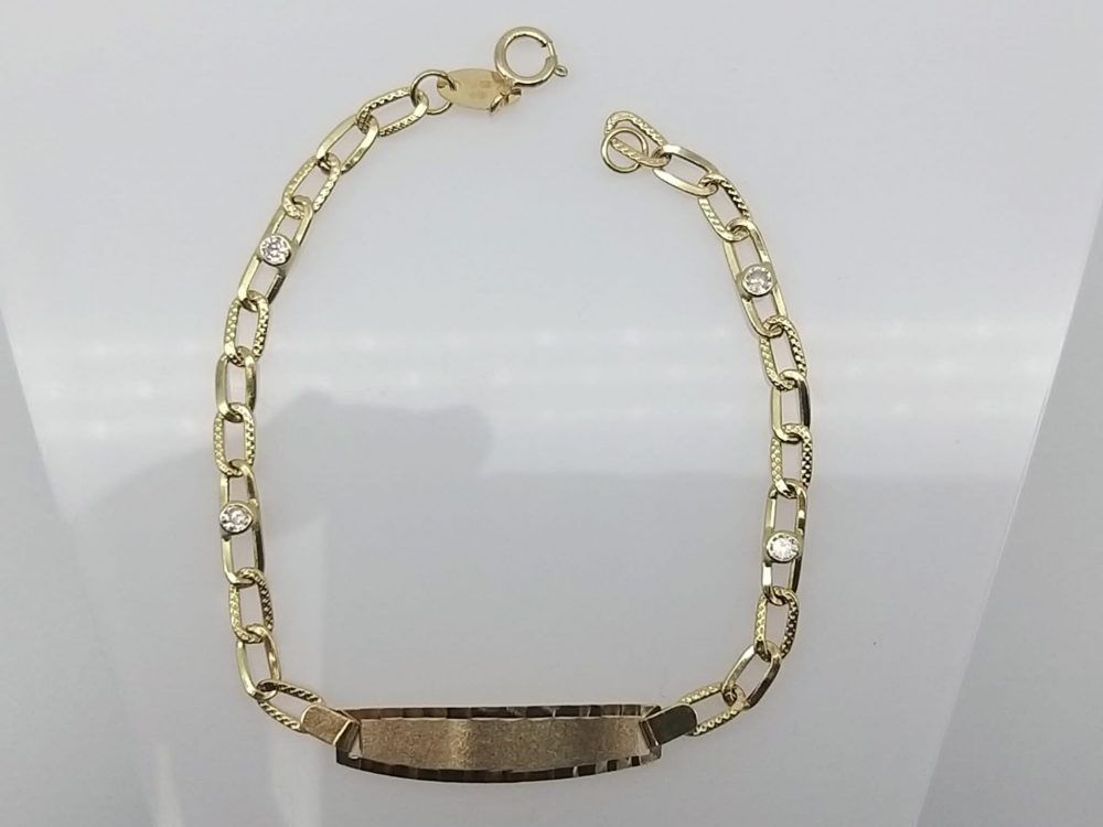Esclava de Comunión en oro de 18 ktes, con chapa para grabar y cadena de 3×1 con circonitas, largo 17cm, ancho 3´5mm, peso 2´3grs.