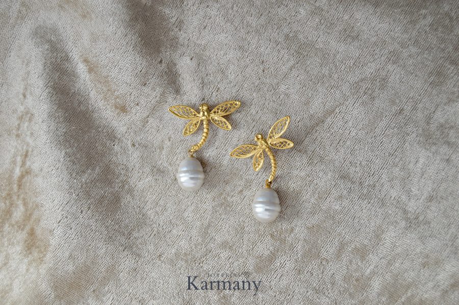Cabezal formado por libélula que sostiene colmena nacarada simulando perla barroca.
