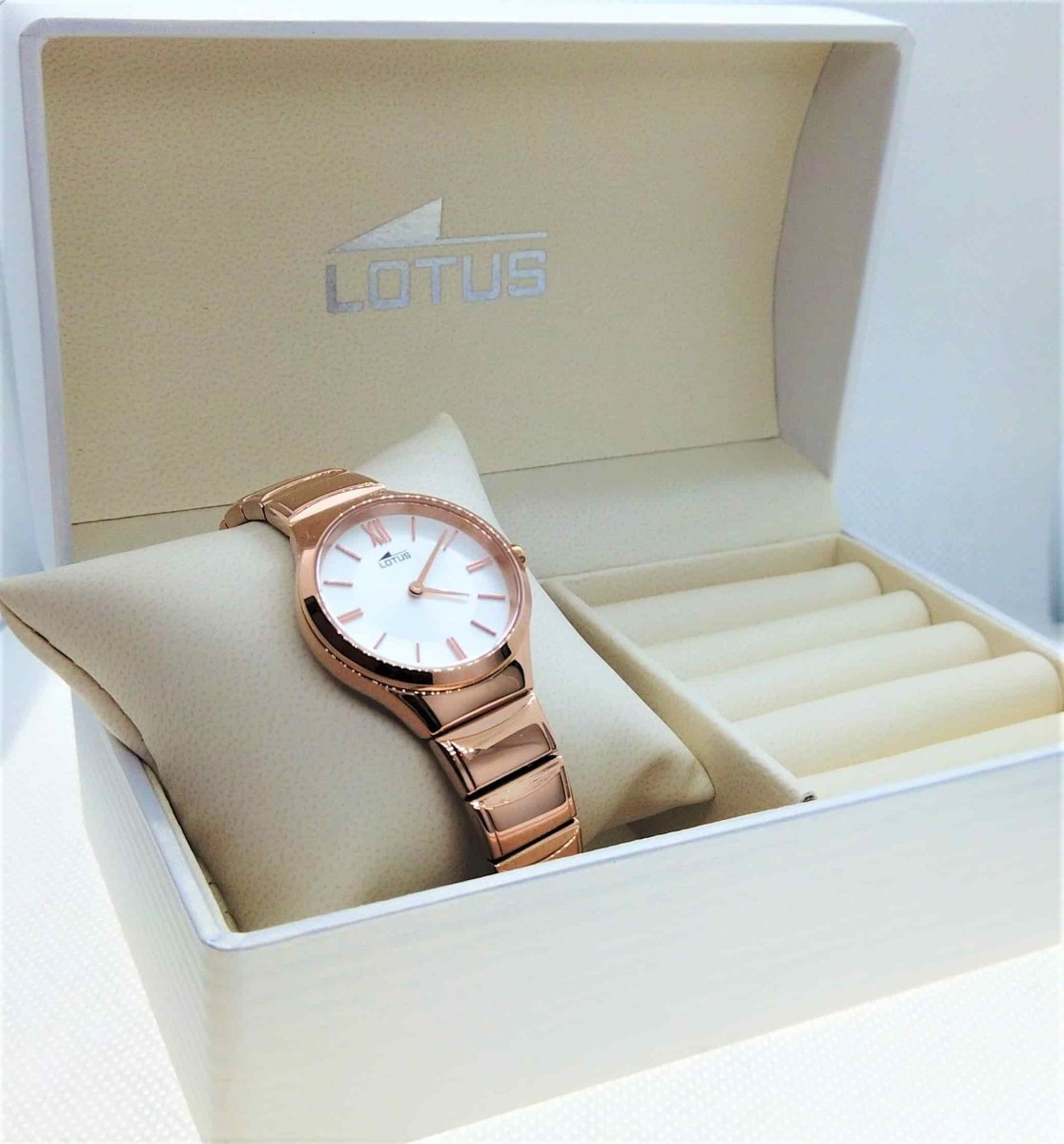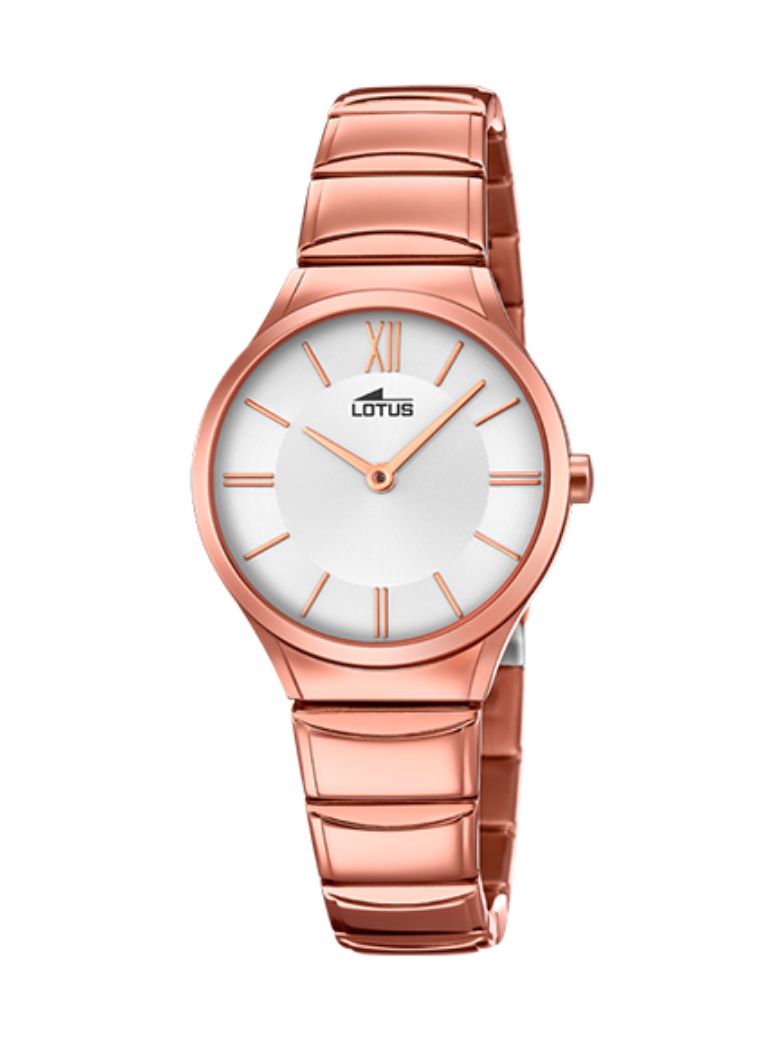 Reloj Lotus rosa, esfera blanca con índices y agujas en rosa.
