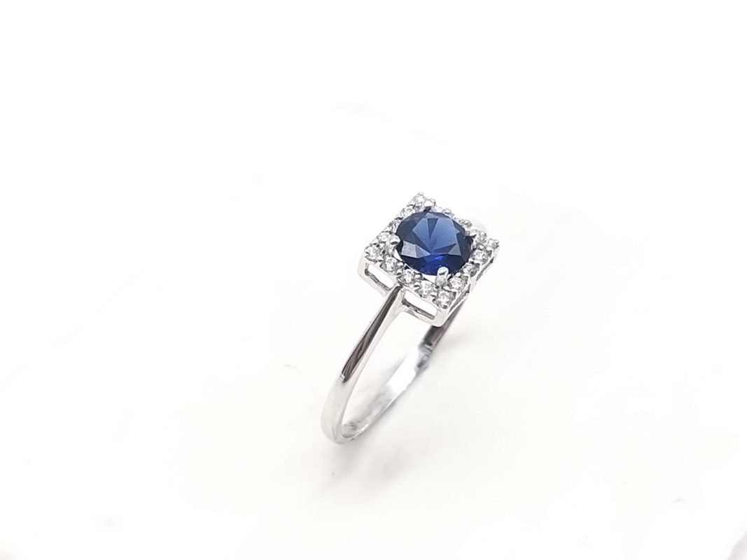 Sortija en oro blanco de 18 ktes, con forma cuadrada de 7mm con circonitas y centro en zafiro.