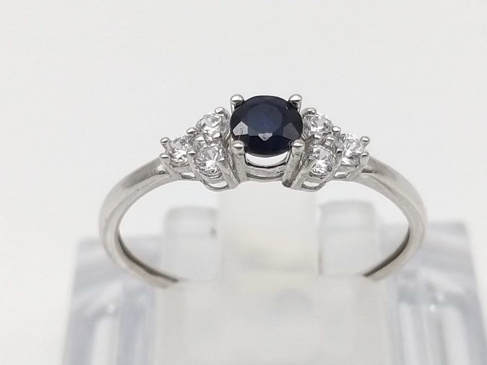 Sortija en oro blanco de 18 ktes, con garra central en zafiro de 4mm y tres circonitas en los laterales.