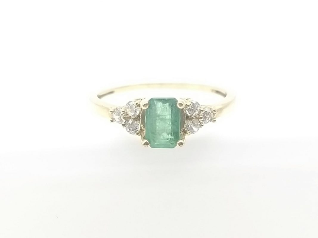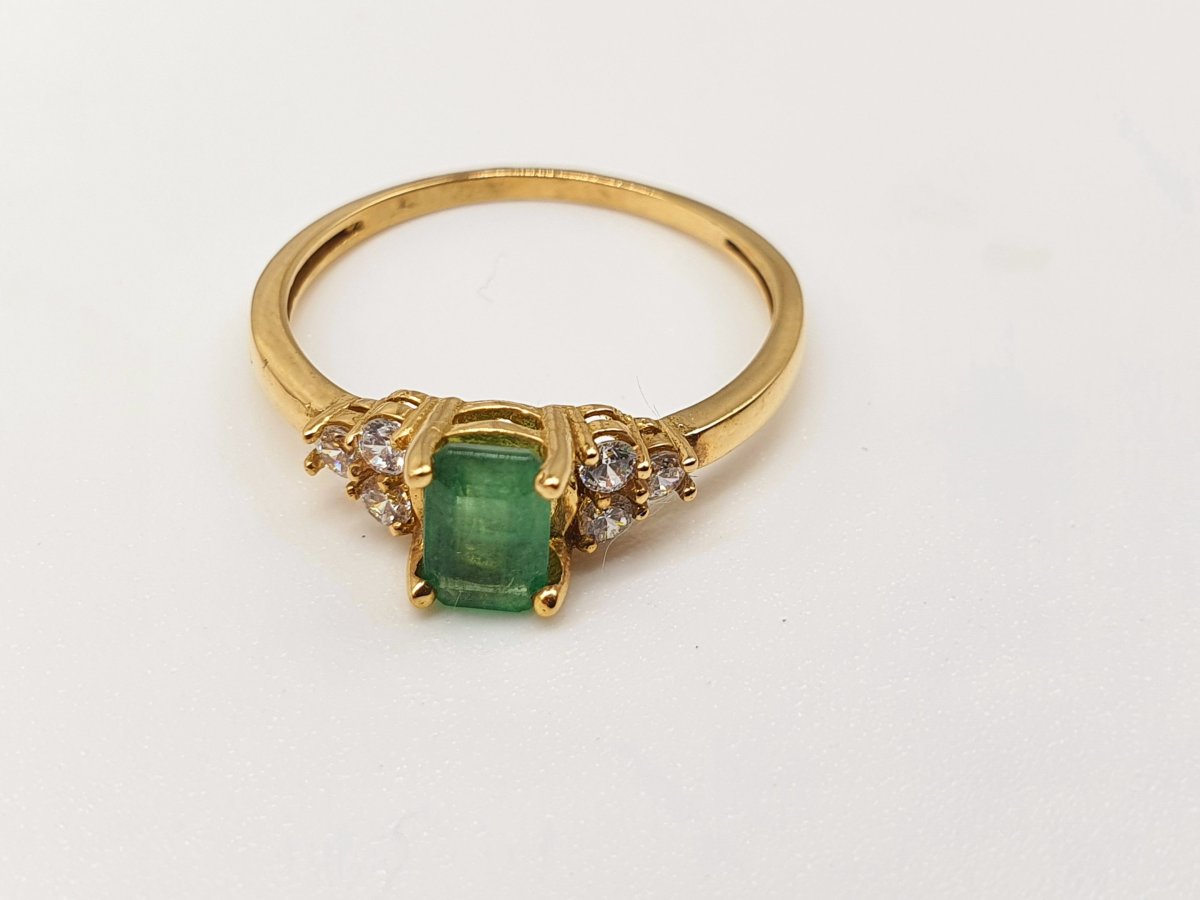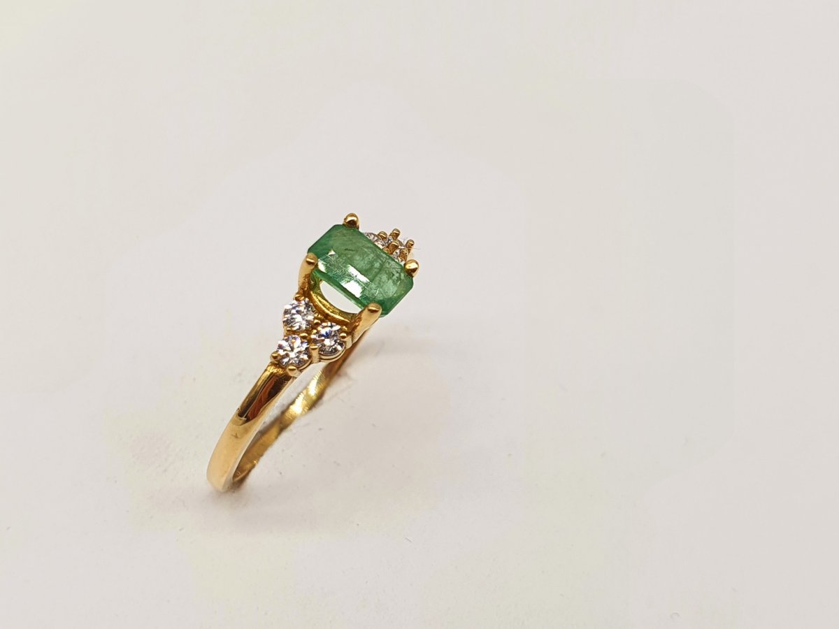 Sortija en oro de 18 kilates, con esmeralda fina de 6x4mm y circonitas en los lados.