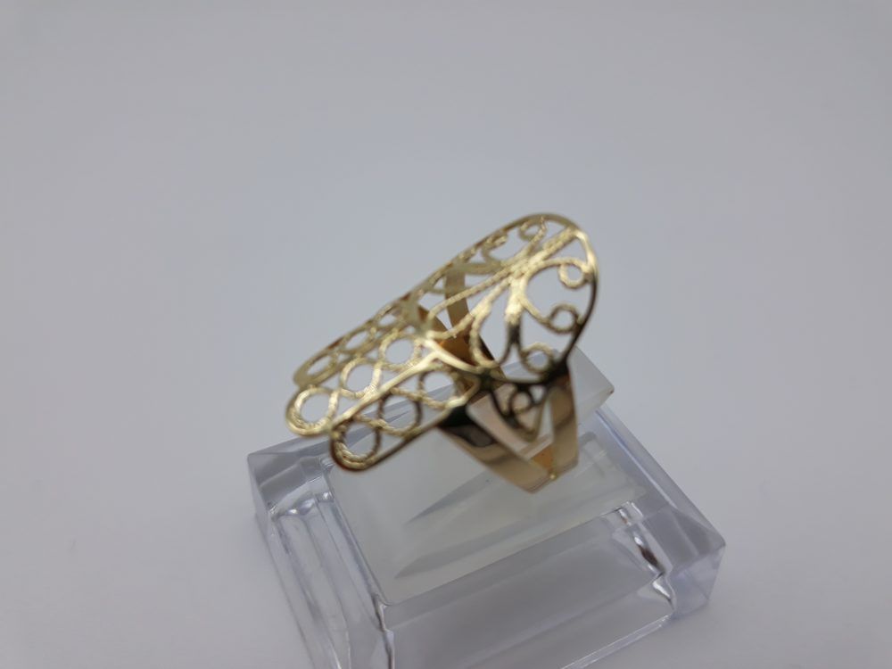 Sortija en oro de 18 ktes, con forma de Mano de Fátima calada en brilo, de 32x20mm, peso 4’10grs.