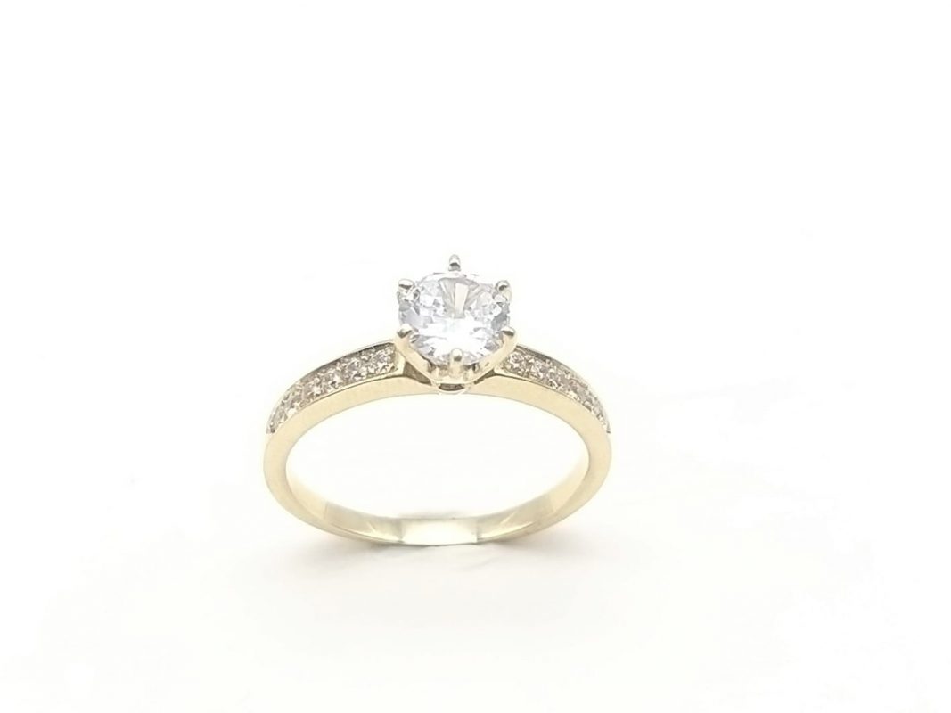 Sortija en oro 18 ktes tipo solitario con circonita central de 6mm. y circonitas engastadas en los laterales.
